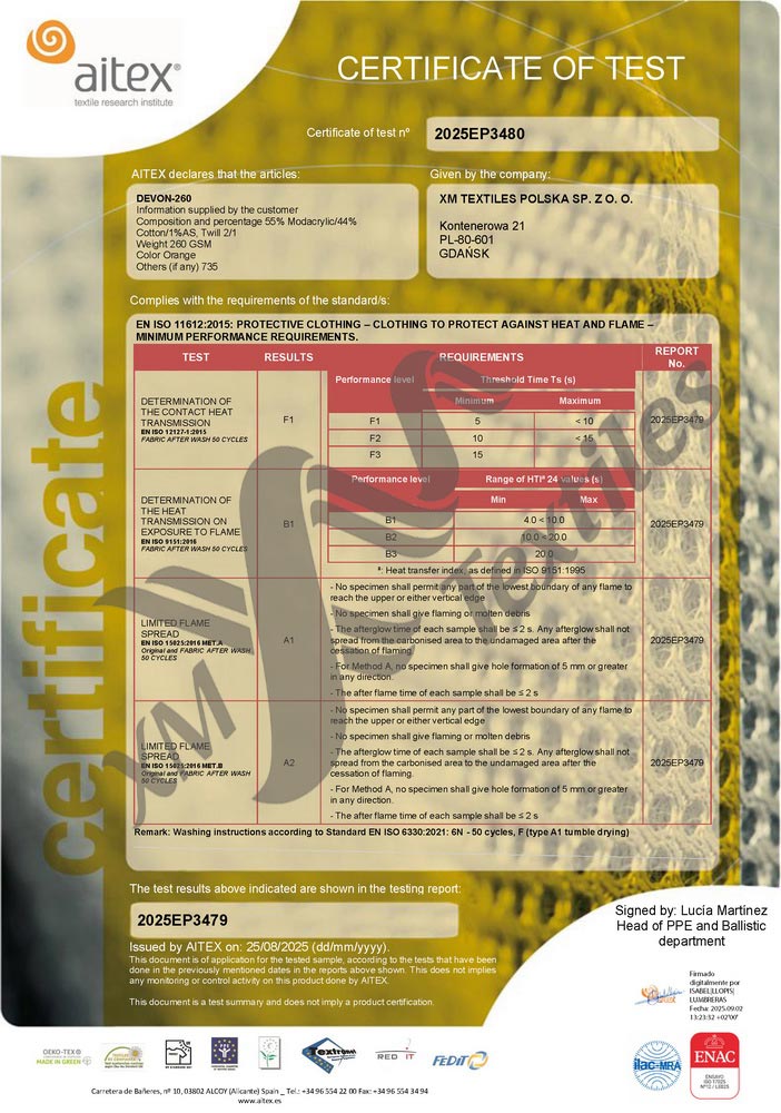 HomeCertificates, Test-reports & TDSXM FireLineDevon-260: EN 11612 (50×60°C) Devon-260: EN 11612 (50×60°C)50×60°C, Devon-260, EN 11612, XM FireLine / January 30, 2026 Download DEVON-260