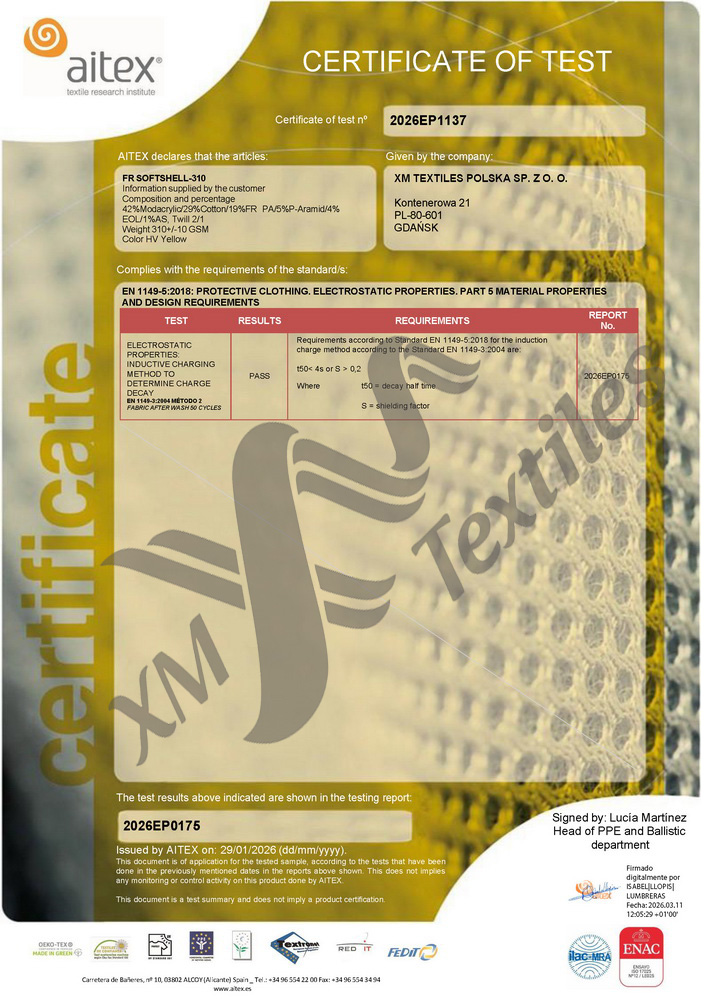 HomeCertificates, Test-reports & TDSXM FireLineFR Sofshell-310: EN 1149 (50×60°C) FR Sofshell-310: EN 1149 (50×60°C)EN 1149, EN 1149-5, FR Softshell-310, XM FireLine / March 12, 2026 Download FR SOFTSHELL-310