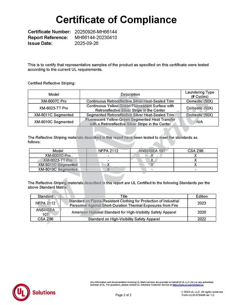 HomeCertificates, Test-reports & TDSXM SilverLineXM-6007C Pro, XM-6023TT Pro, XM-8011C, XM-8010C NFPA 2112, ANSI107+CSA Z96 XM-6007C Pro, XM-6023TT Pro, XM-8011C, XM-8010C NFPA 2112, ANSI107+CSA Z96Ansi 107, CSA Z96, NFPA 2112, XM SilverLine, XM-6007C Pro, XM-6023TT, XM-8010C, XM-8011C / October 17, 2025 Download XM-6023-TT GrosgrainSew-on Reflective tape EN 20471XM-8011C MALTA HTSHeat transfer Reflective tapes EN 469XM-6007C PRO HTSHeat transfer Reflective tapes EN 20471XM-8010C CORSICA HTSHeat transfer Reflective tapes EN 469