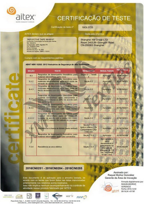 HomeCertificates, Test-reports & TDSXM SilverLineXM-6010: NBR 15292 (25×60°C) XM-6010: NBR 15292 (25×60°C)25×60°C, NBR 15292, XM SilverLine, xm-6010, XM-6010 Certificates / December 2, 2016 Download XM-6010 CORSICASew-on Reflective tapes EN 469 Reflective tape XM-6010 certified to NBR 15292
