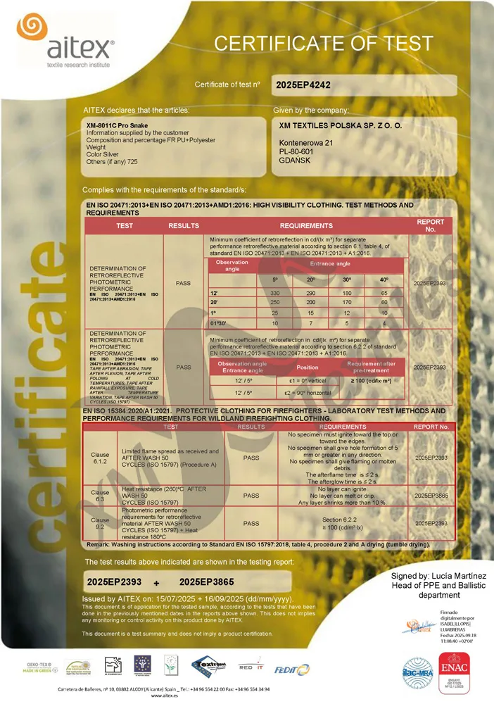 HomeCertificates, Test-reports & TDSXM SilverLineXM-8011C Pro Snake EN 20471, EN 15384 (50×75°C) XM-8011C Pro Snake EN 20471, EN 15384 (50×75°C)EN 20471, ISO 15797, XM SilverLine, XM-8011C Pro Snake / September 29, 2025 Download XM-8011C PRO SNAKEHeat transfer Reflective tapes EN 469