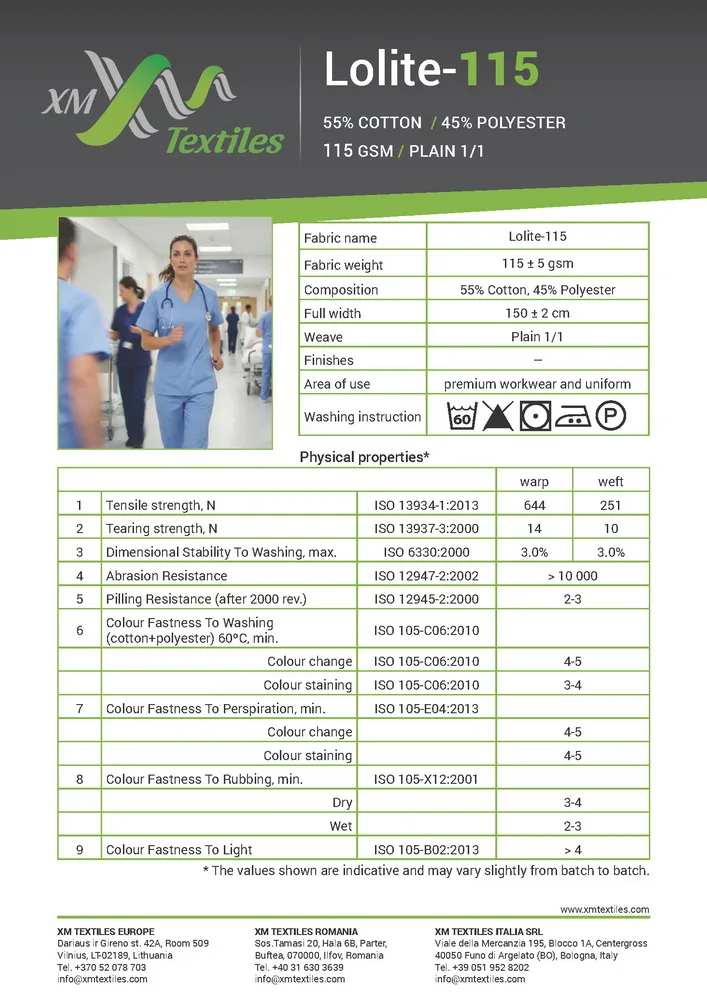 HomeCertificates, Test-reports & TDSXM TextilesLolite-115 Technical datasheet Lolite-115 Technical datasheetLolite-115, TDS XMT / March 19, 2026 Download LOLITE-115