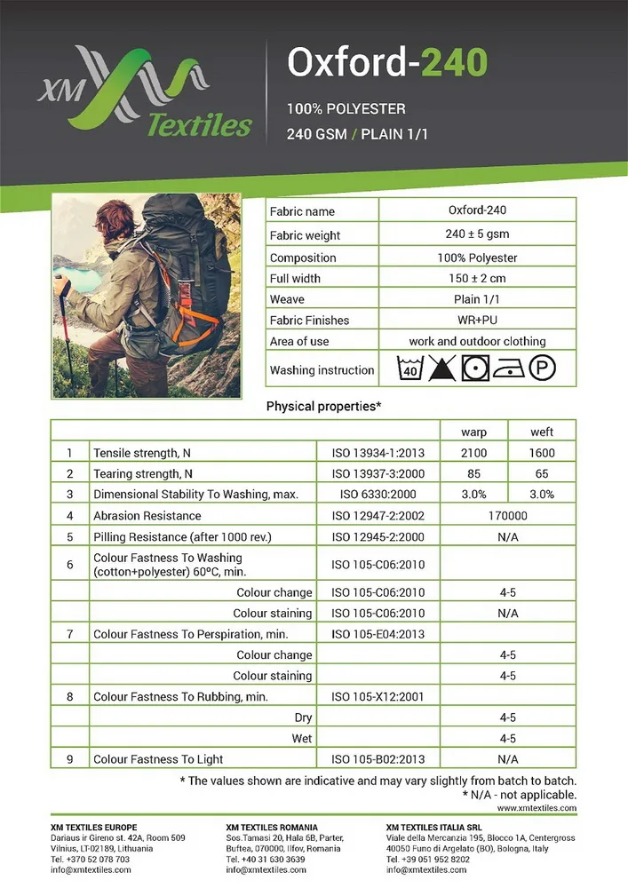 HomeCertificates, Test-reports & TDSXM TextilesOxford-240 Technical datasheet Oxford-240 Technical datasheetOxford-240, TDS XMT / October 15, 2024 Download OXFORD-240 (KORDURA)