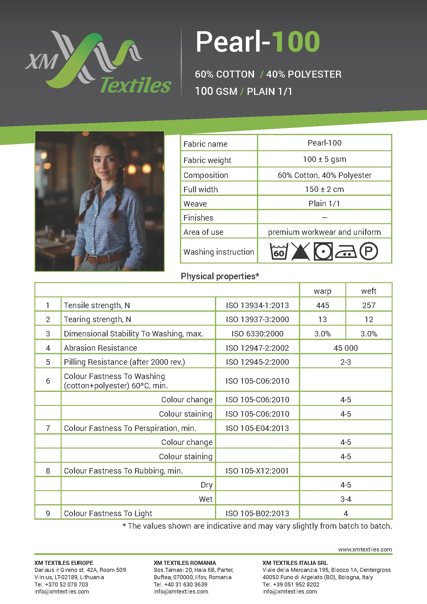 HomeCertificates, Test-reports & TDSXM TextilesPearl-100 Technical datasheet Pearl-100 Technical datasheetPearl-100, TDS XMT / March 19, 2026 Download LOLITE-115