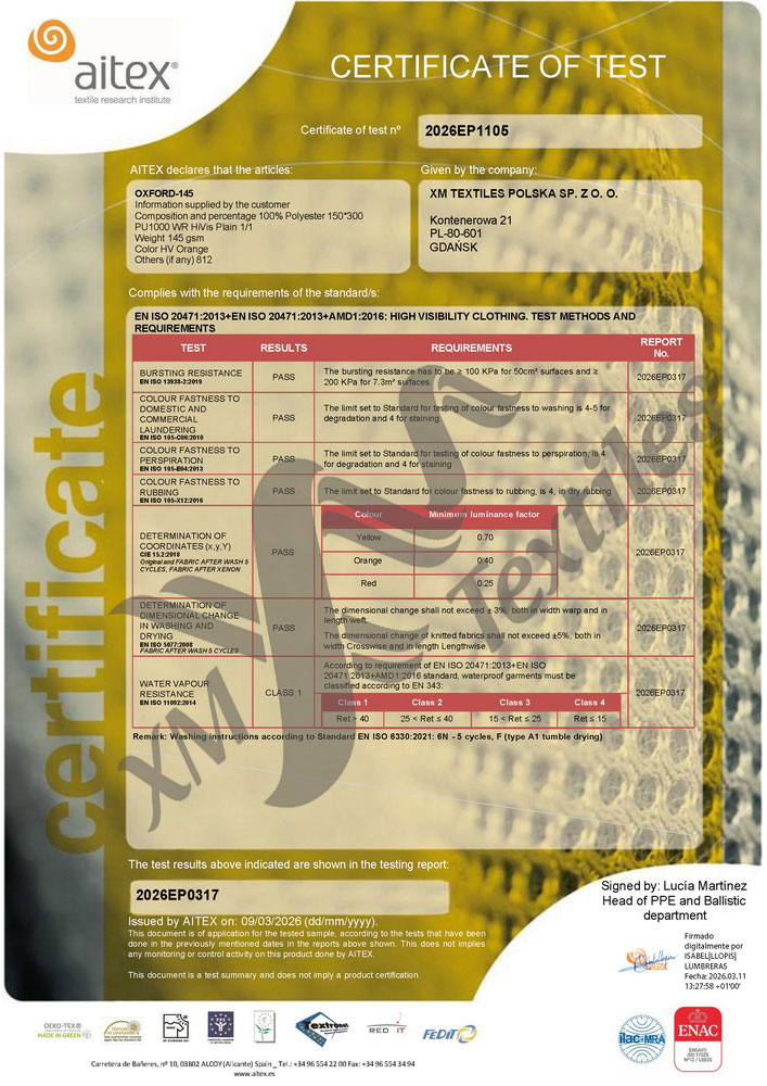 HomeCertifikáty, zkušební protokoly a TDSXM TextilesOxford-145 (HV Orange): EN 20471 (5×60°C) Oxford-145 (HV Orange): EN 20471 (5×60°C)EN 20471, Oxford-145, XM Textiles / June 2, 2021 Download OXFORD-145