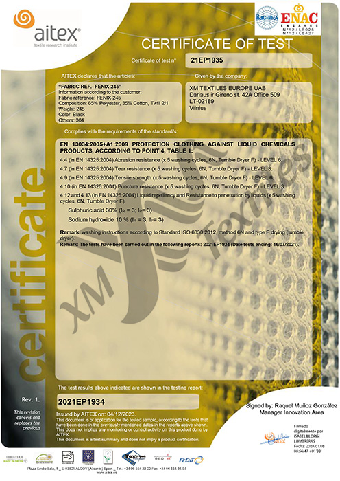 InicioCertificados, informes de prueba y ficha técnicaXM TextilesFenix-245: EN 13034 (5×60°C) Fenix-245: EN 13034 (5×60°C)EN 13034, Fenix-245, XM Textiles / julio 22, 2021 Download FÉNIX-245 Fenix-245 certificado según EN 13034