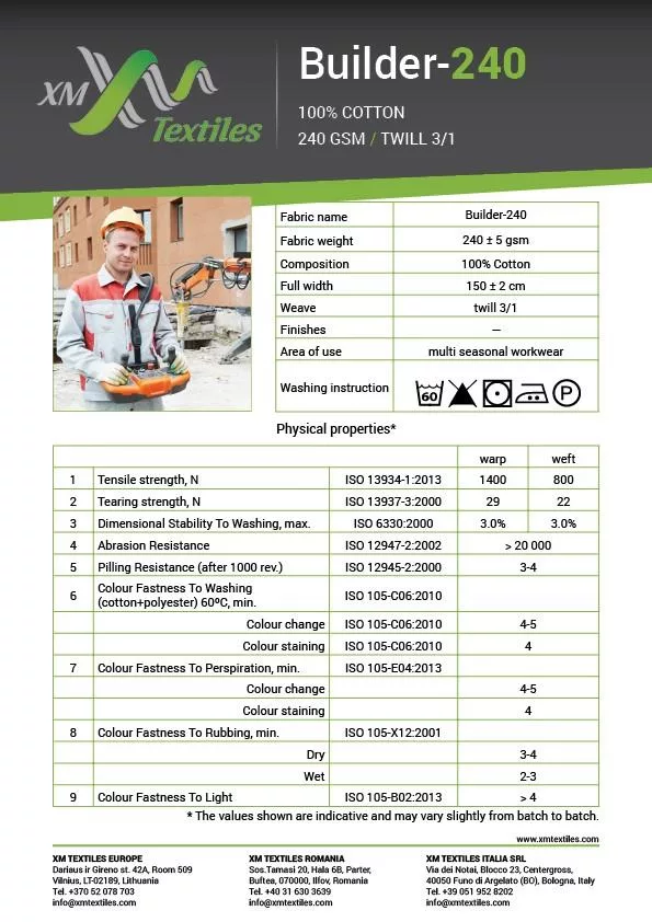BUILDER-240 es un tejido de 100% algodón duradero y cómodo. Tiene la ventaja de una excelente transpirabilidad del algodón puro. Con su peso equilibrado, puede utilizarlo para cualquier prenda de uniforme, desde abrigos y guantes hasta delantales y chaquetas de invierno. Vea nuestros informes de pruebas
