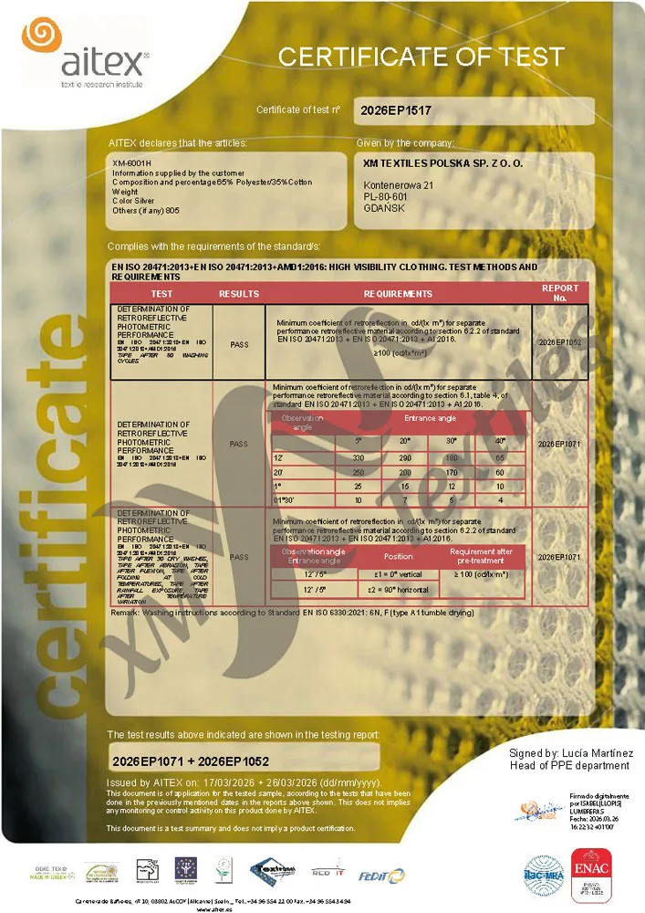 XM-6001H: EN 20471 (50x60C) 30 dry cleaning