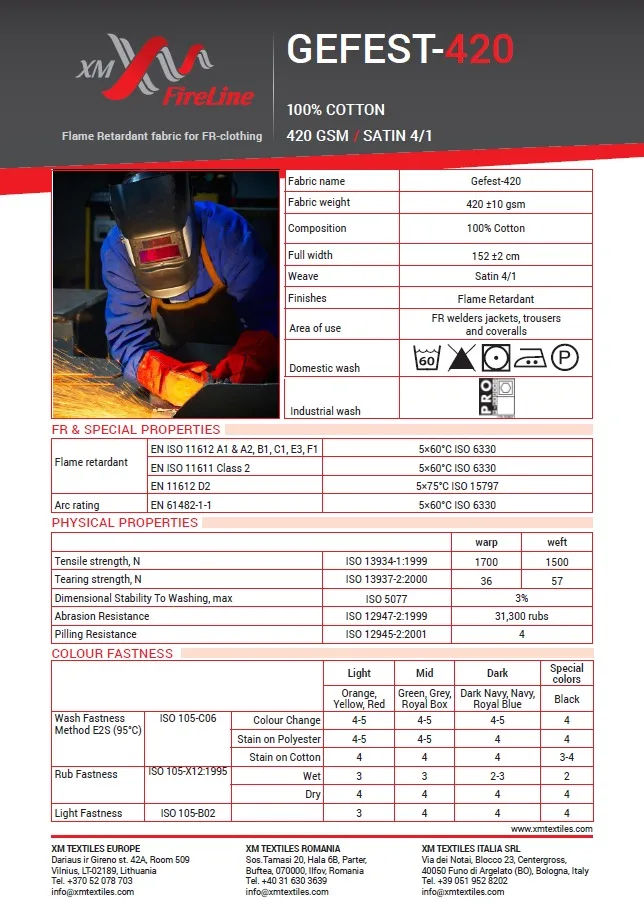 Caratteristiche principali: Ritardante di fiamma, lavaggio industriale, 100×750C (diffusione limitata della fiamma), 50×750C (EN 11612), EN 11612 D1 (5×750C)