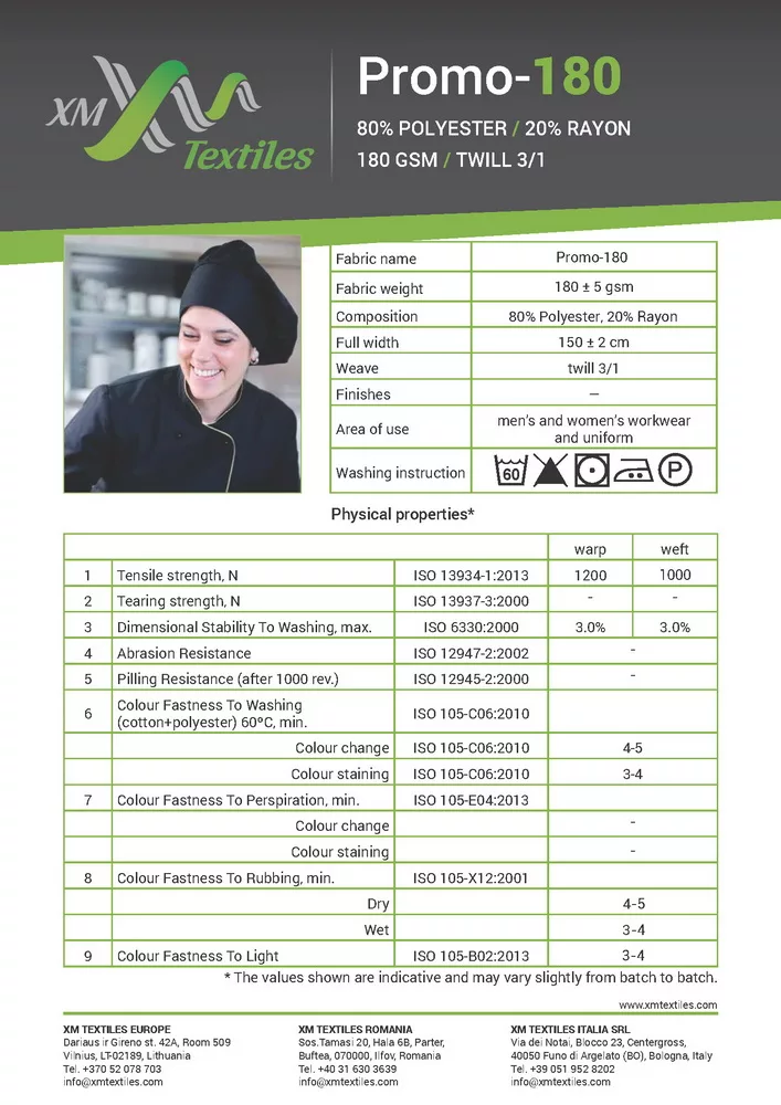 PROMO-180 è un tessuto leggero in poliestere e rayon, sviluppato per capi promozionali, abbigliamento aziendale e abbigliamento da lavoro leggero, dove un aspetto pulito e una facile maneggevolezza sono importanti quanto la resistenza. L’80% di poliestere garantisce un’elevata resistenza alla trazione, stabilità dimensionale ed eccellente mantenimento del colore, mentre il 20% di rayon aggiunge morbidezza al tatto, una caduta naturale e una piacevole sensazione a contatto con la pelle, rendendo il tessuto comodo da indossare per tutto il turno.