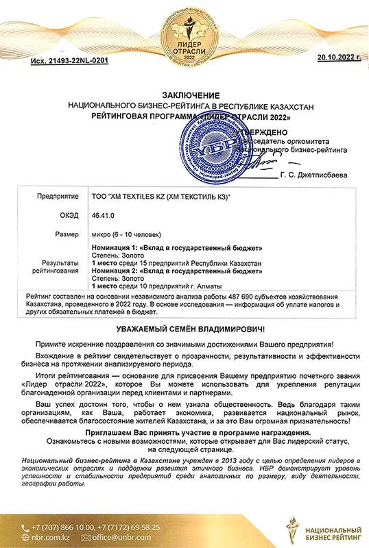 Национальный бизнес-рейтинг Казахстана наградил XM Textiles KZ золотым дипломом за «Вклад в государственный бюджет», а также званием «Лидер отрасли».