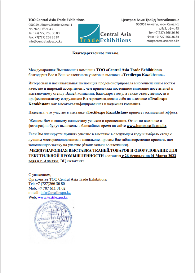 Участие компании XM Textiles в выставке, проявившееся в повышенном интересе к стенду, а также ответственности и профессионализме сотрудников, было отмечено благодарственным письмом от организаторов.