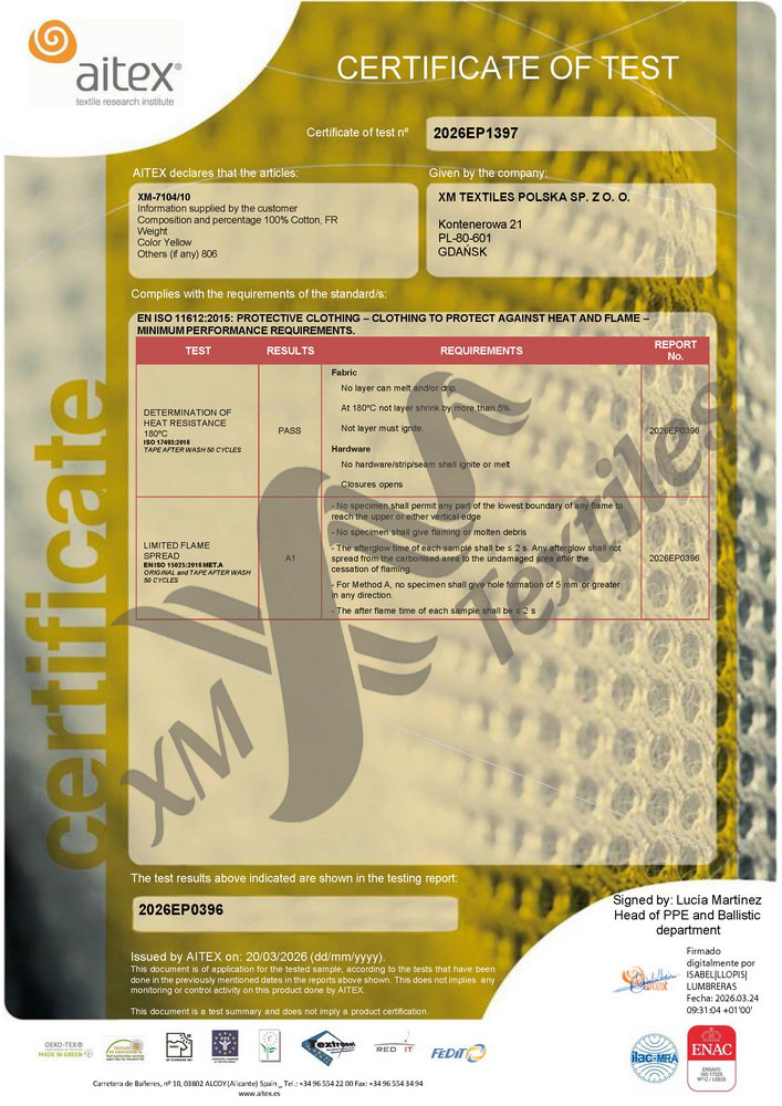 ГлавнаяСертификаты и СпецификацииXM SilverLineXM-7104/10: EN 11612 (50×60°C) XM-7104/10: EN 11612 (50×60°C)EN 11612, XM SilverLine, XM-7104 / 31 марта, 2026 Download XM-7104/10 LISOПришивные светоотражающие ленты | EN 469