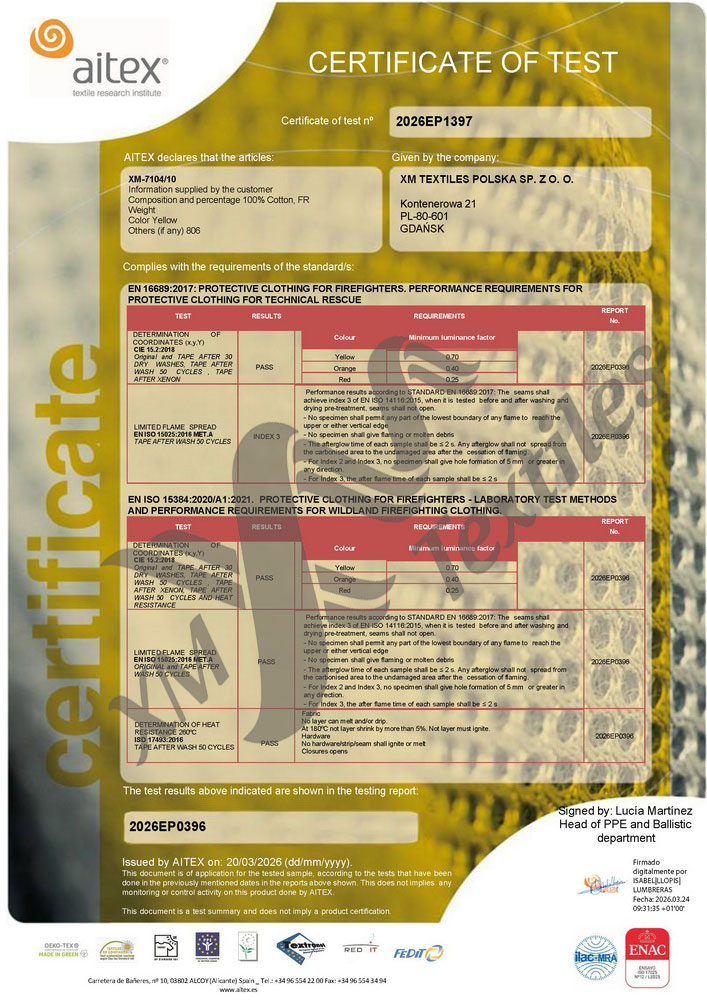 HomeCertyfikaty, raporty z badań i arkusze danych technicznychXM SilverLineXM-7104/10: EN 16689 (50×60°C) XM-7104/10: EN 16689 (50×60°C)EN 16689, XM SilverLine, XM-7104 / 27 marca, 2026 Download XM-7104/10 LISOTaśmy do naszywania | EN 469