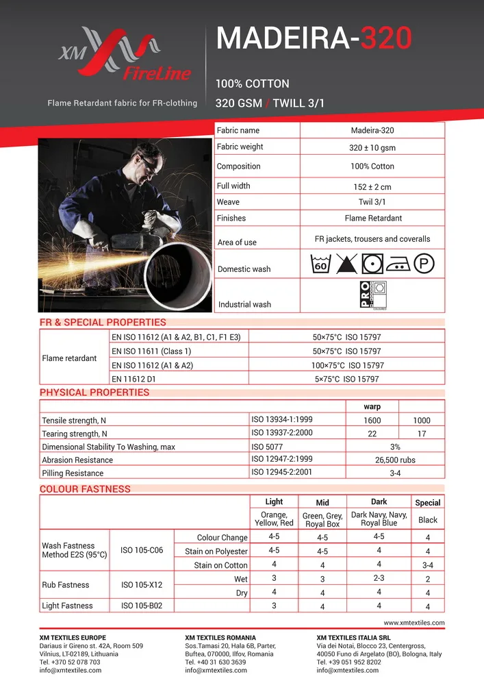 Madeira-320 is a flame-retardant 100% cotton fabric with a density of 320 gsm, in a classic 3/1 twill weave. Madeira-320 is a pure cotton flame retardant protective fabric made from long staple pure cotton.